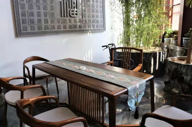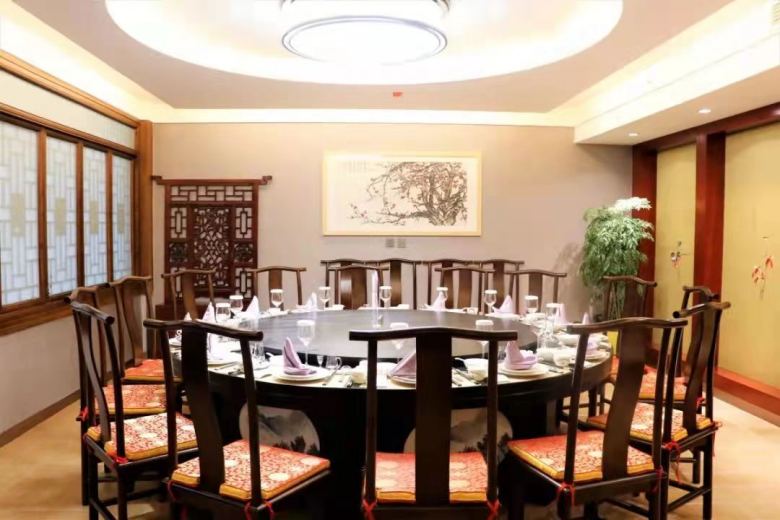 經(jīng)過多次溝通和討論,神木乾茂飯店宴會(huì)廳桌椅均采用中式風(fēng)格,餐椅選用官帽椅,整體實(shí)木結(jié)構(gòu)榫卯工藝。餐桌方面,為了考慮實(shí)用性和控制成本預(yù)算,最終敲定使用帶玻璃轉(zhuǎn)盤的圓桌,另外,根據(jù)空間的需要,在部分休息接待室配套了幾套茶臺(tái)供顧客喝茶使用。