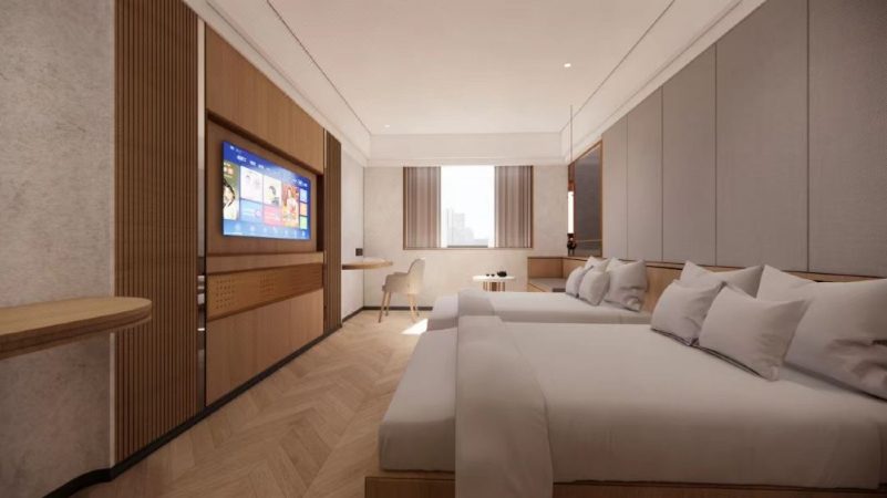 前面我們說過,客戶的酒店位置絕佳,處于城中心的廣場(chǎng)旁。因此,即使是二次翻新改造,客戶依然沒有采用家具貼膜的方式去圖省錢,而是要重新設(shè)計(jì)酒店客房,再按照效果圖去定制家具。
